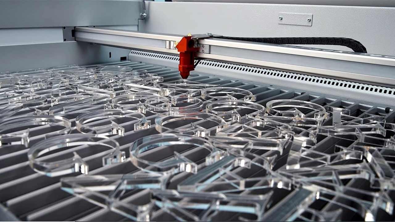 - صنعت مواد پلاستیکی: در صنعت مواد پلاستیکی برای برش و حکاکی قطعات پلاستیکی استفاده میشود. این فرایند در تولید قطعات خودرو، تجهیزات الکترونیکی، لوازم خانگی، محصولات پلاستیکی صنعتی و غیره مورد استفاده قرار میگیرد.
